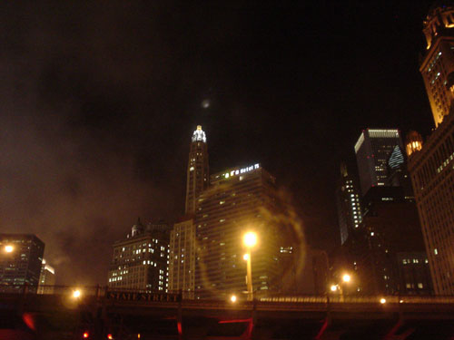 On Monday, Erica took me along as her date on the annual Goodman Theatre staff boat outing. I've been out on the lake on a sailboat, but never on one of these cruise boats -- it was the same kind of flat, open boats they use for the Chicago architecture cruises (and yes, the same kind of boat that just got Dave Matthews Band's tour bus sewage dumped on it -- which we joked about everytime we went under a bridge.) We just cruised around the lake inside the breakwater until it got dark and then went up and down the Chicago river once. Plenty of snacks and beer and jello shots(!). Oh, those jello shots were nasty.